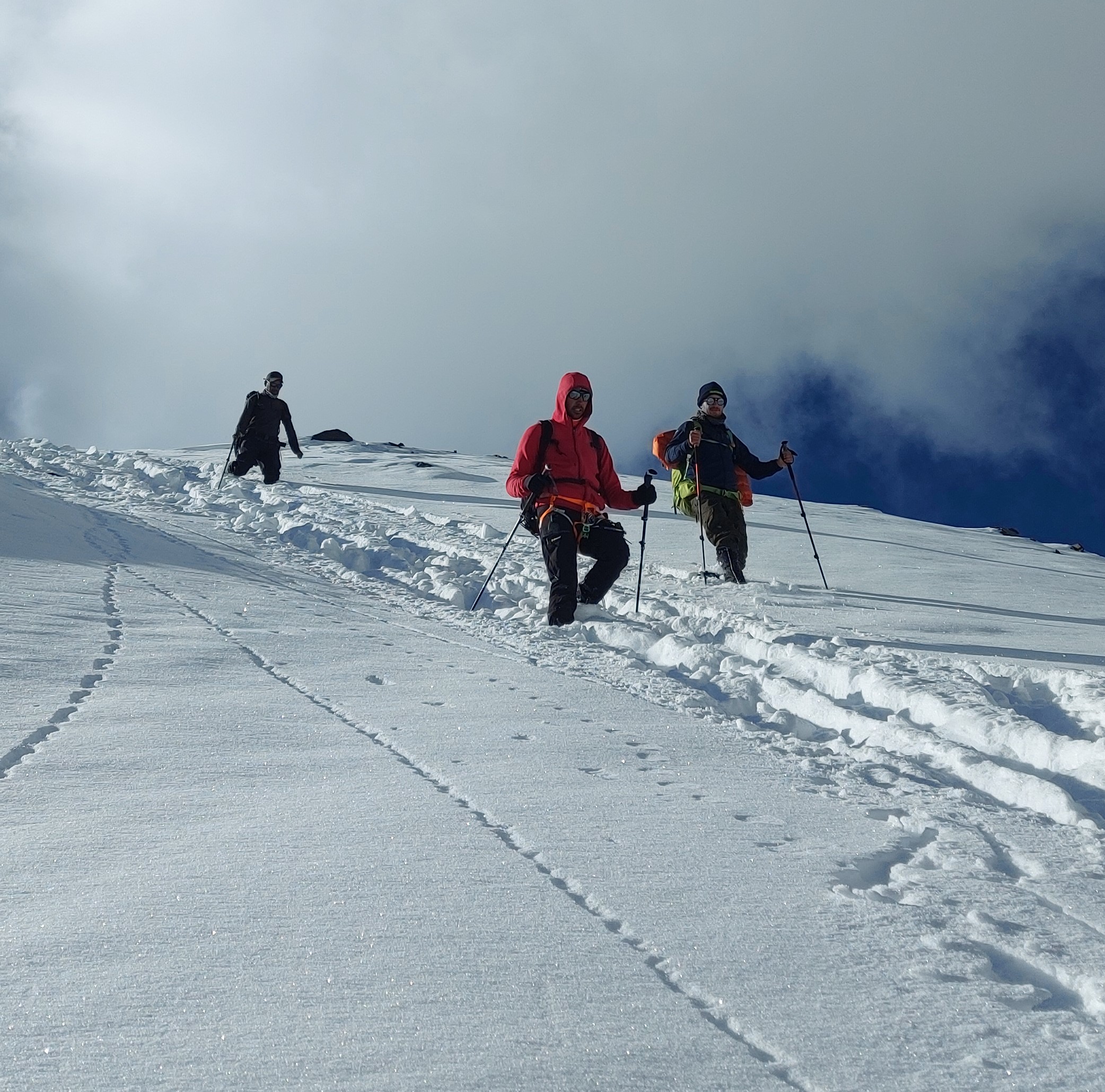 We begin the summit push very early around 1 to 2 a.m. Wearing headlamps and full gear, we start the ascent from High Camp. The trail is a mix of snow and ice, gradually getting steeper as we gain height. We follow a glacial route, roped up for safety. The use of crampons and ascenders becomes necessary as we approach the summit ridge. After 6–7 hours of steady climbing, we reach the summit of Dzo Jongo West (6,300m). From the top, we’re rewarded with panoramic views of the Zanskar, Ladakh, and Karakoram ranges. After spending some time there, we begin a careful descent back to Base Camp, which takes around 3–4 hours.