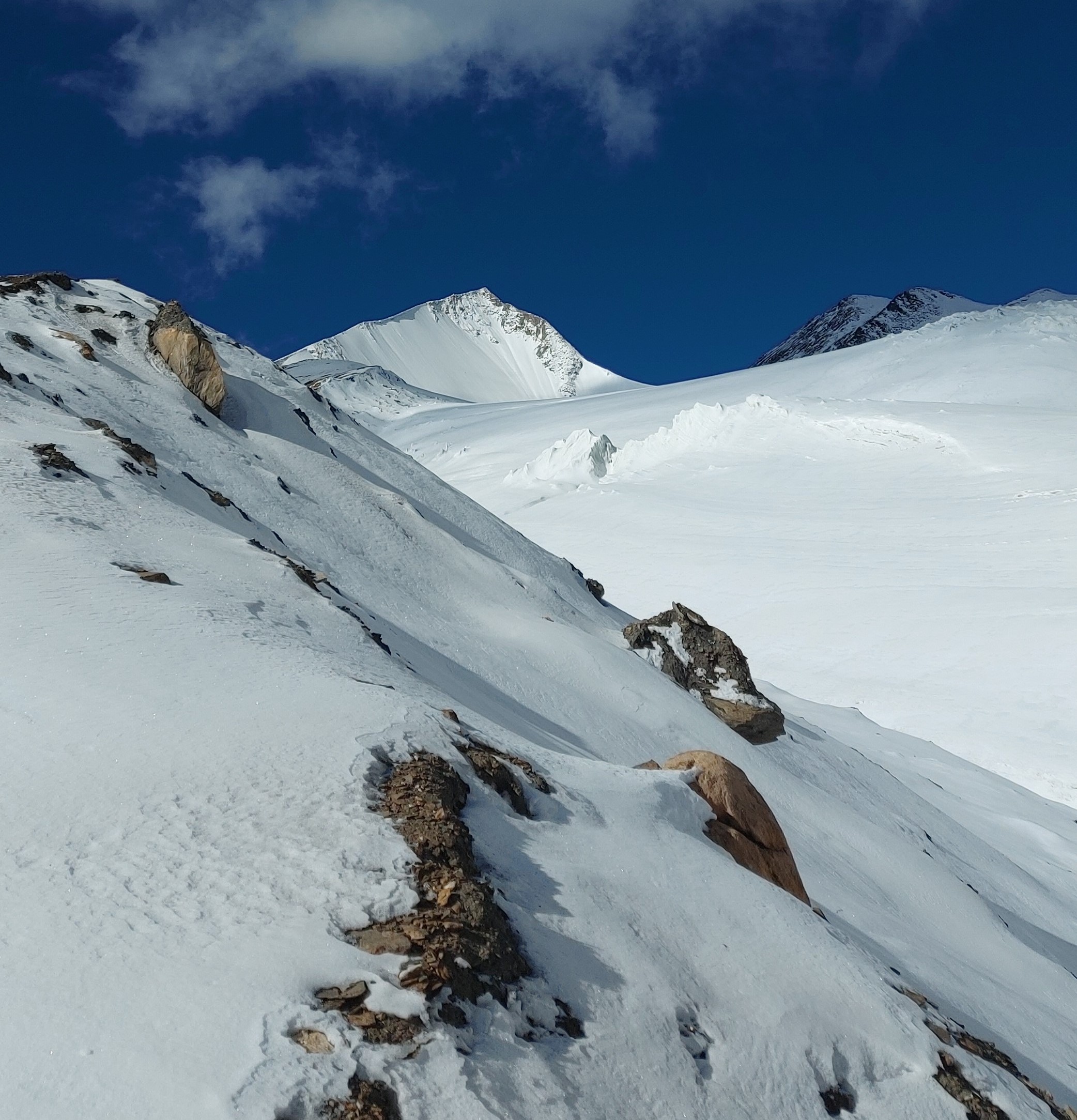 After breakfast at Nimaling, we begin our gradual ascent toward Dzo Jongo Base Camp. The trail heads southeast, following a less-traveled path across grassy slopes and rocky ridges. Along the way, we get excellent views of Kang Yatse behind us and the rugged ridge of Dzo Jongo ahead. The climb is moderate but steady, allowing us to slowly adapt to the rising altitude. We reach Base Camp, nestled beneath the western face of Dzo Jongo, surrounded by dramatic rock and scree slopes.