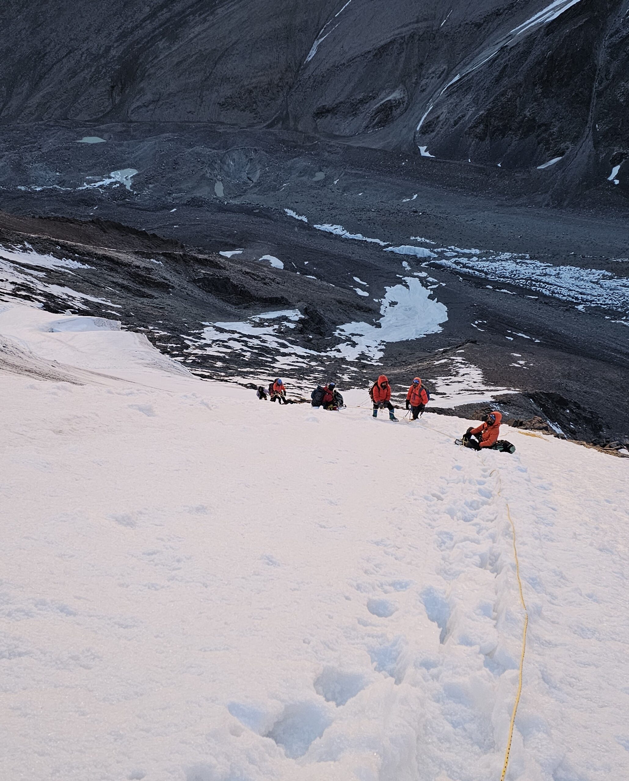 Today is a vital day for both acclimatization and technical preparation. We stay at Advance Base Camp, where the thin air and high altitude help our bodies prepare for the summit push. In the morning, we practice using climbing gear such as crampons, harnesses, ascenders, and ropes under the guidance of our experienced climbing guides. You will also learn safety techniques and get familiar with how to move on snow and ice. If weather permits, we may do a short climb on a nearby snowfield for hands-on experience. The rest of the day is for rest, hydration, and mental preparation for the next big stage reaching Camp 1 closer to the summit route.