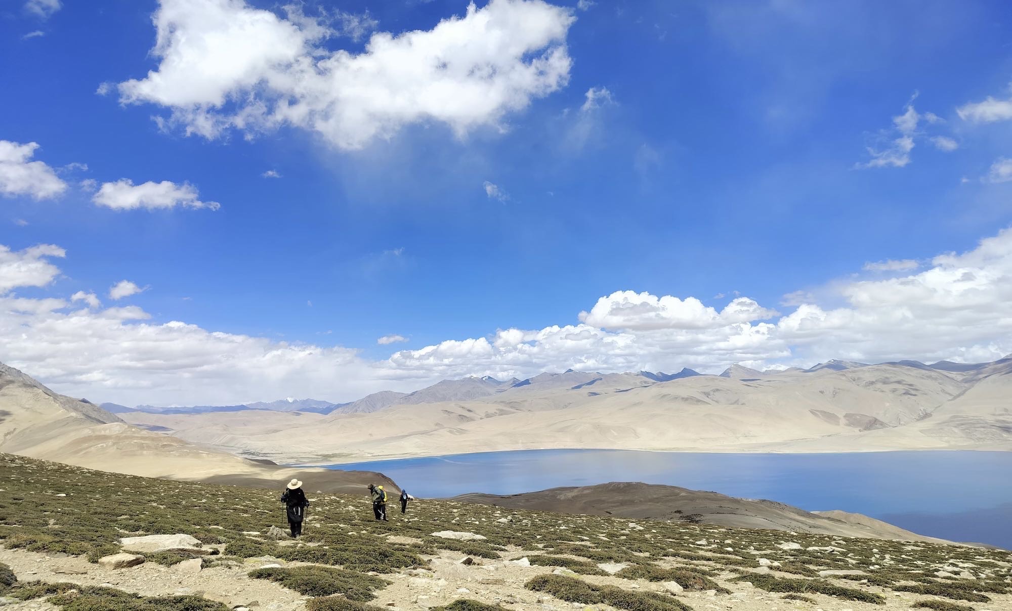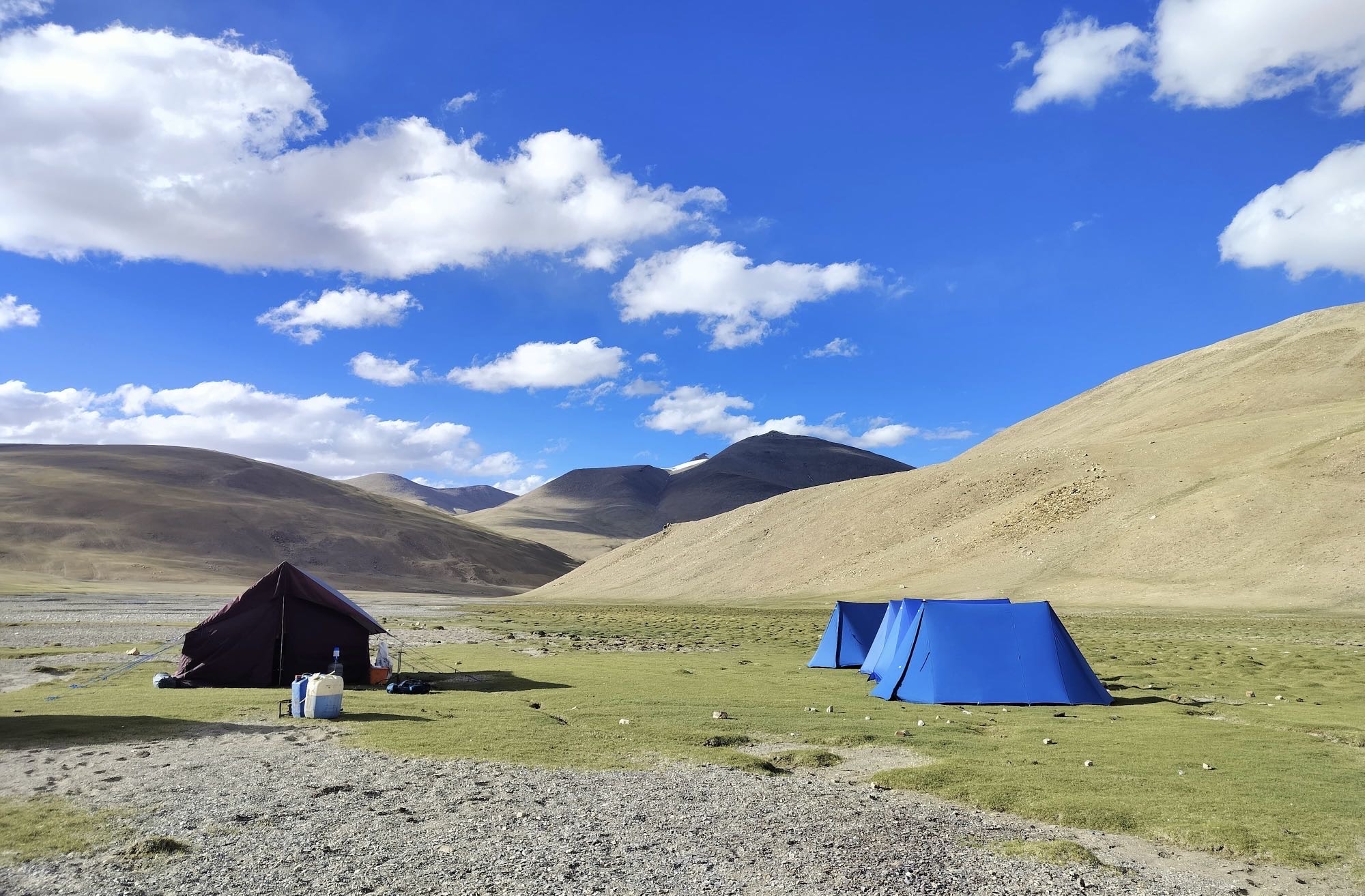 After breakfast, we begin descending from Gyama Burma toward the beautiful high-altitude valley of Karzok Phu, which sits above the famous Tso Moriri Lake. Along the way, we enjoy fantastic views of Mentok Kangri growing larger in the distance. The air becomes slightly more oxygen-rich as we descend, making walking feel easier. By afternoon, we reach the green pastures of Karzok Phu and camp beside streams that flow down from the high peaks. The location is scenic, peaceful, and ideal for the final approach to base camp.