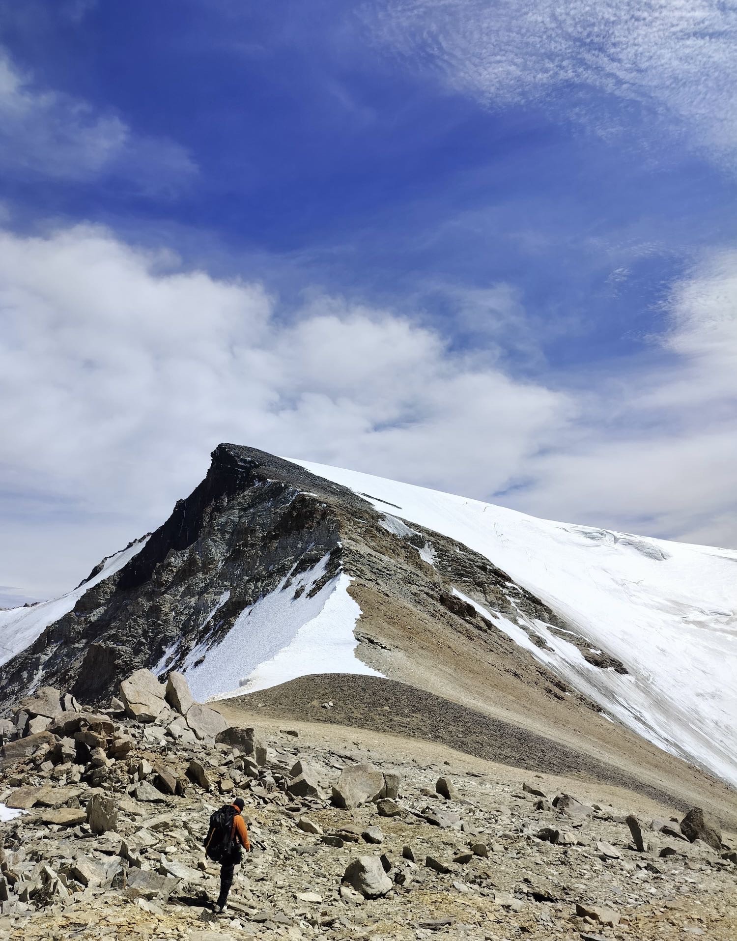 Today we leave Karzok Phu and begin ascending steadily toward Mentok Kangri Base Camp. The trail climbs gently at first and then gradually steepens as we enter alpine terrain. The towering presence of Mentok Kangri becomes clearer as we get closer to its base. The views of Tso Moriri Lake behind us are stunning, reflecting the changing sky and distant mountains. After 4-5 hours of trek, we reach Base Camp (5,250m).